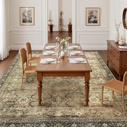 Washable Area Rugs 8×10 Vintage Brown, Large Indoor Rug for Living Room Bedroom, Traditional Farmhouse Carpet for Dining Room, Charcoal Olive
